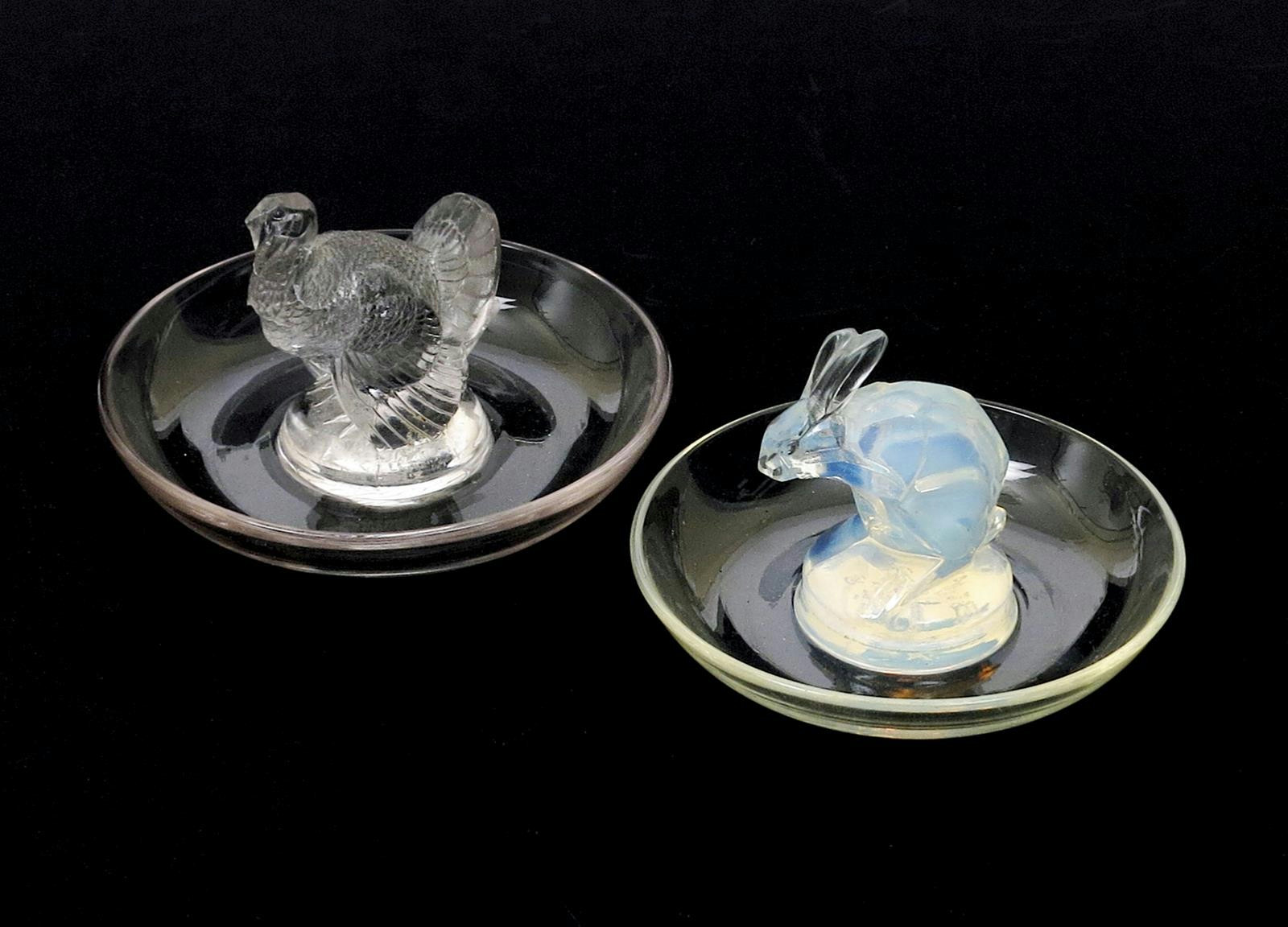 'Lapin' No.285 a Lalique opalescent glass cendrier designed by Rene Lalique, and a Dindon clear and frosted glass Cendrier, etched R Lalique France No.285, 9.5cm. diam.