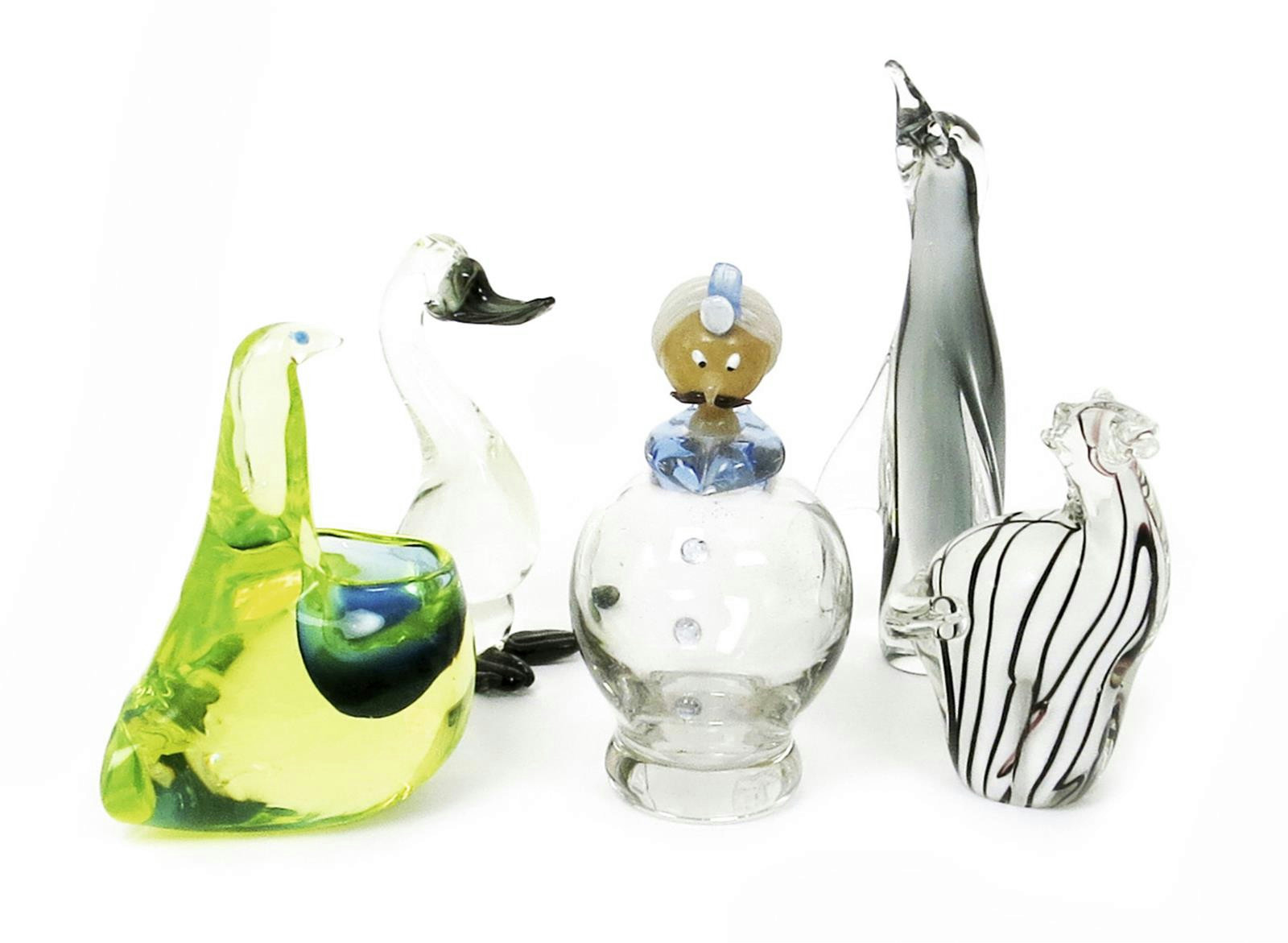 A comical glass decanter and stopper, possibly Murano, modelled as a rotund man, his turbaned head the stopper, and four glass sculptures unsigned 21cm. high