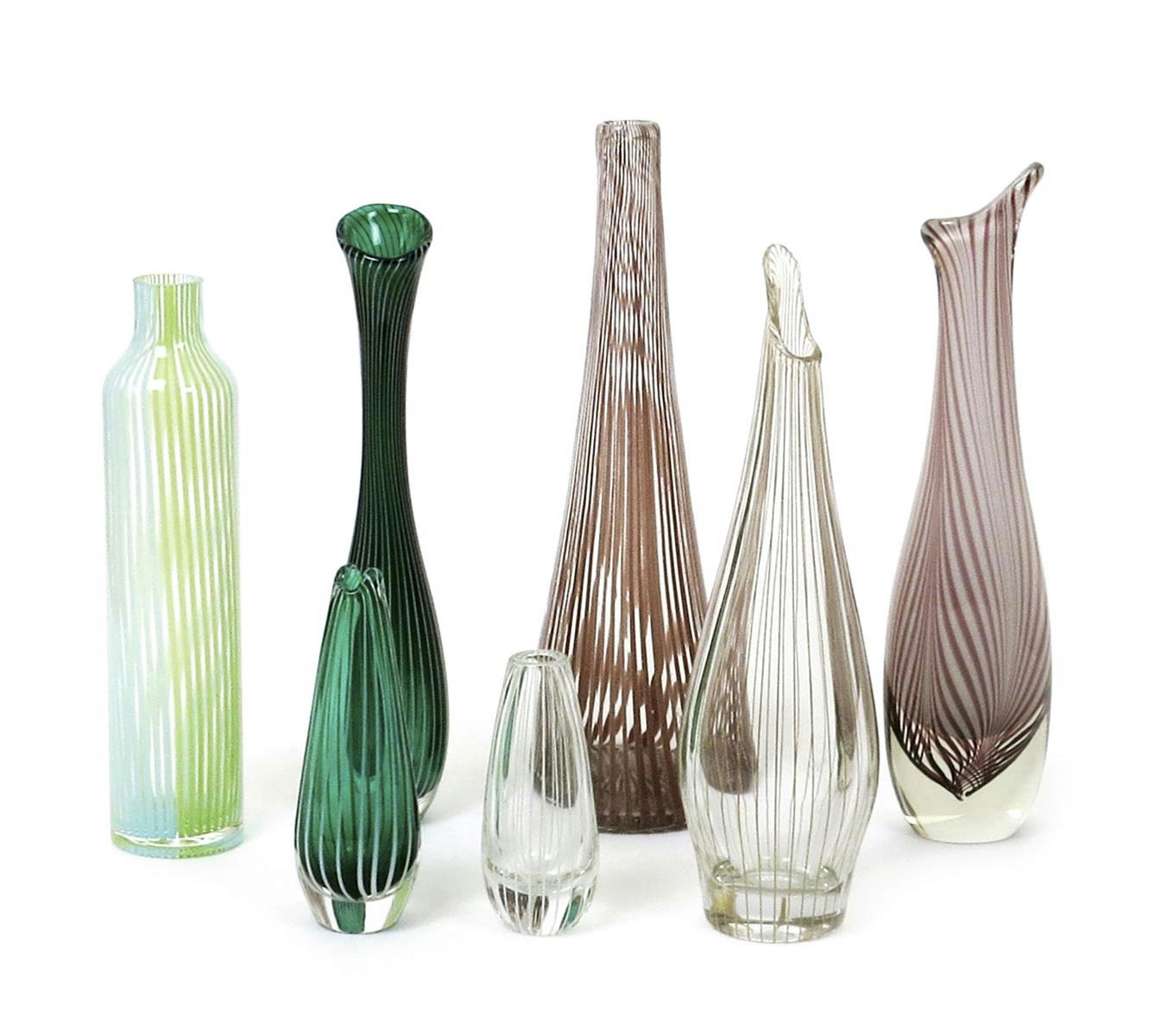 A Kosta glass bottle vase, emerald green glass with white stripes, cased in clear, and six other glass vases etched Kosta LH1056 33cm. high