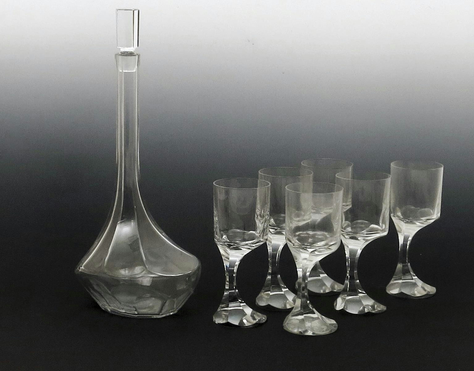 A Baccarat glass Narcisse decanter and six goblets designed by Boris Tabakoff, faceted stem with offset body, acid-etched mark, decanter 40.5cm. high