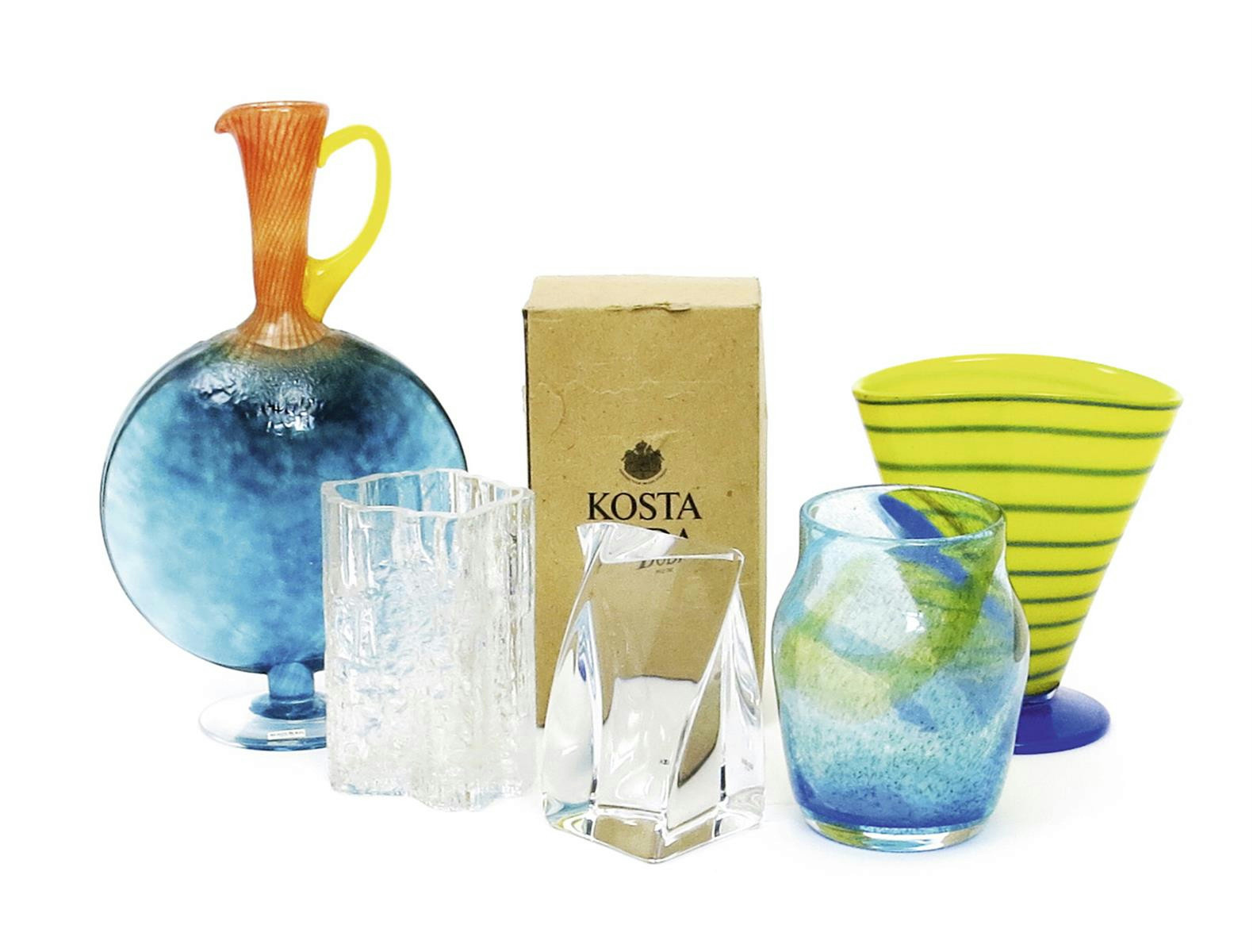 A Kosta Boda glass ewer, the flattened blue glass disk body with flaring cylindrical orange striped neck, applied yellow handle, on applied clear glass foot, a Kosta Boda clear glass sculpture, and nine other glass items paper Kosta label 35.5cm. high