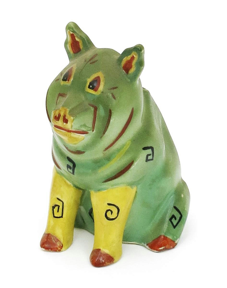 'The Lucky Pig' a Louis Wain porcelain pig, painted in shades of green and yellow highlighted in red impressed marks, facsimile signature 12cm. high