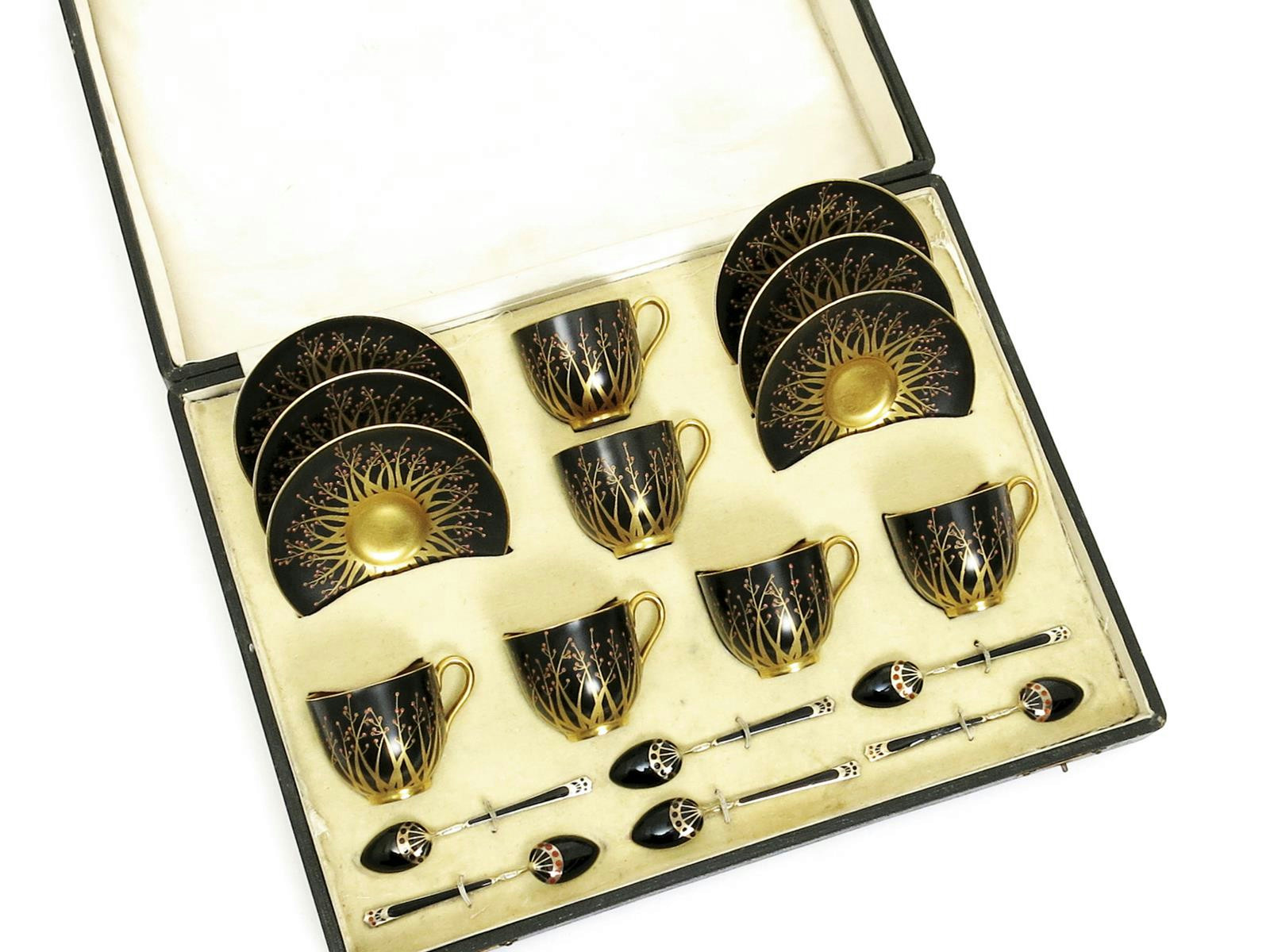 A Royal Worcester Art Deco cased coffee set for six, pattern 1086, printed in gilt and enamelled in coral with stylised flower design, comprising, six cups and saucers and six enamelled silver spoons, printed marks, spoons hallmarked saucers 9.5cm. diam.