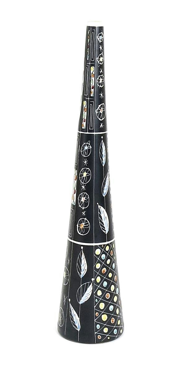 A Denby Pottery Cheviot vase, designed by Glynn Colledge, CH.502, tapering cylindrical form, painted with abstract panels on a black ground printed mark, painted signature 47cm. high