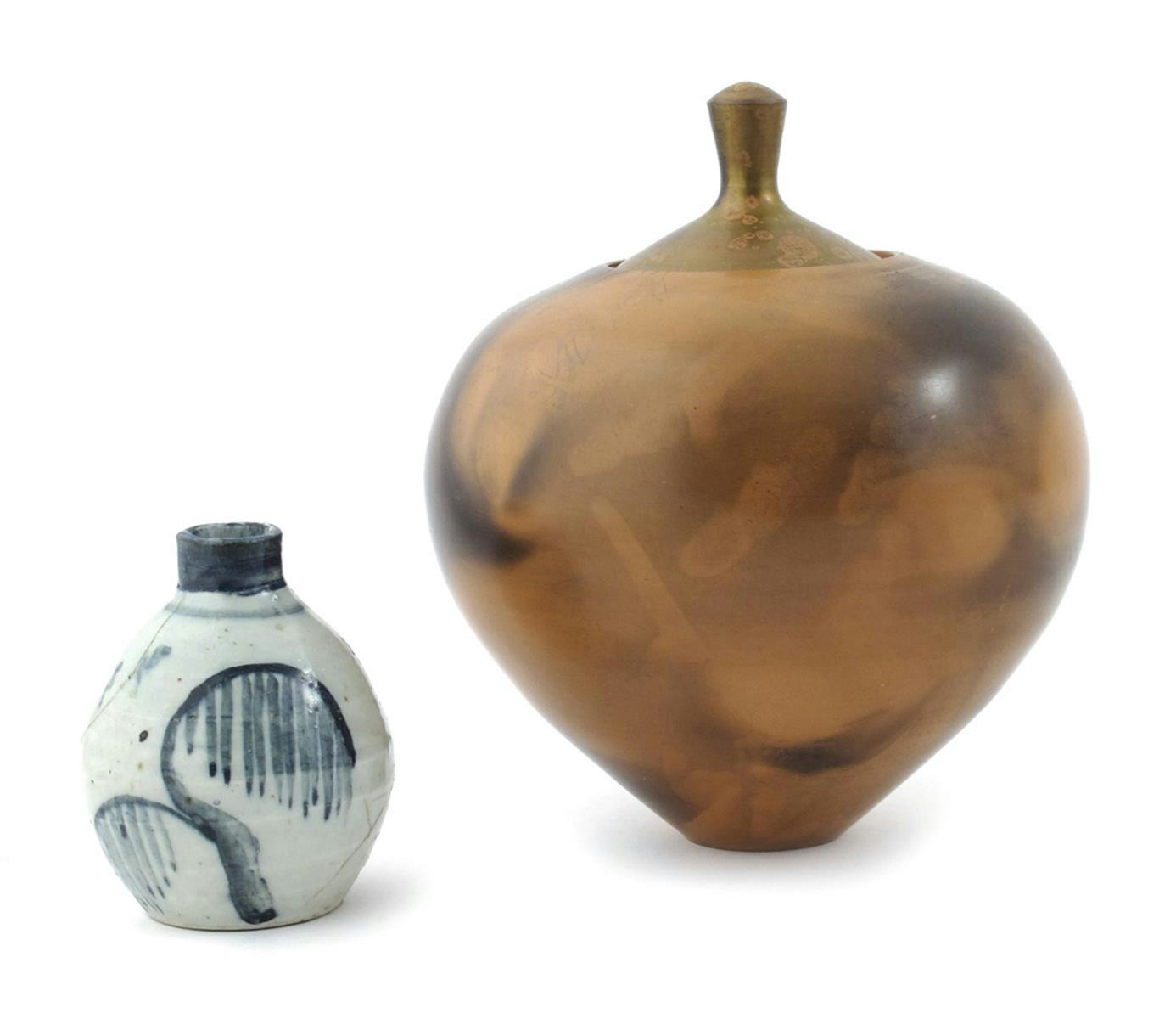 a burnished pot and cover, the cover with gilded decoration a John Ward earthenware vase and a David Whiting vase impressed and incised marks, John Ward broken and repaired 21cm. high