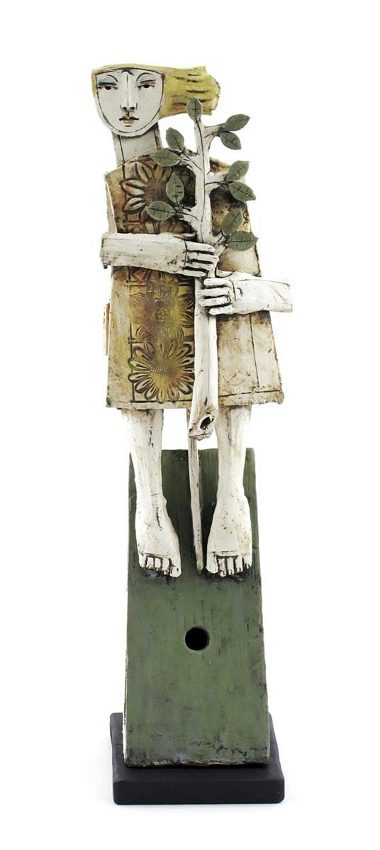Woman Holding a foliate stem, a pottery figure sculpture, painted in colours incised signature, impressed 1396, 50cm. high