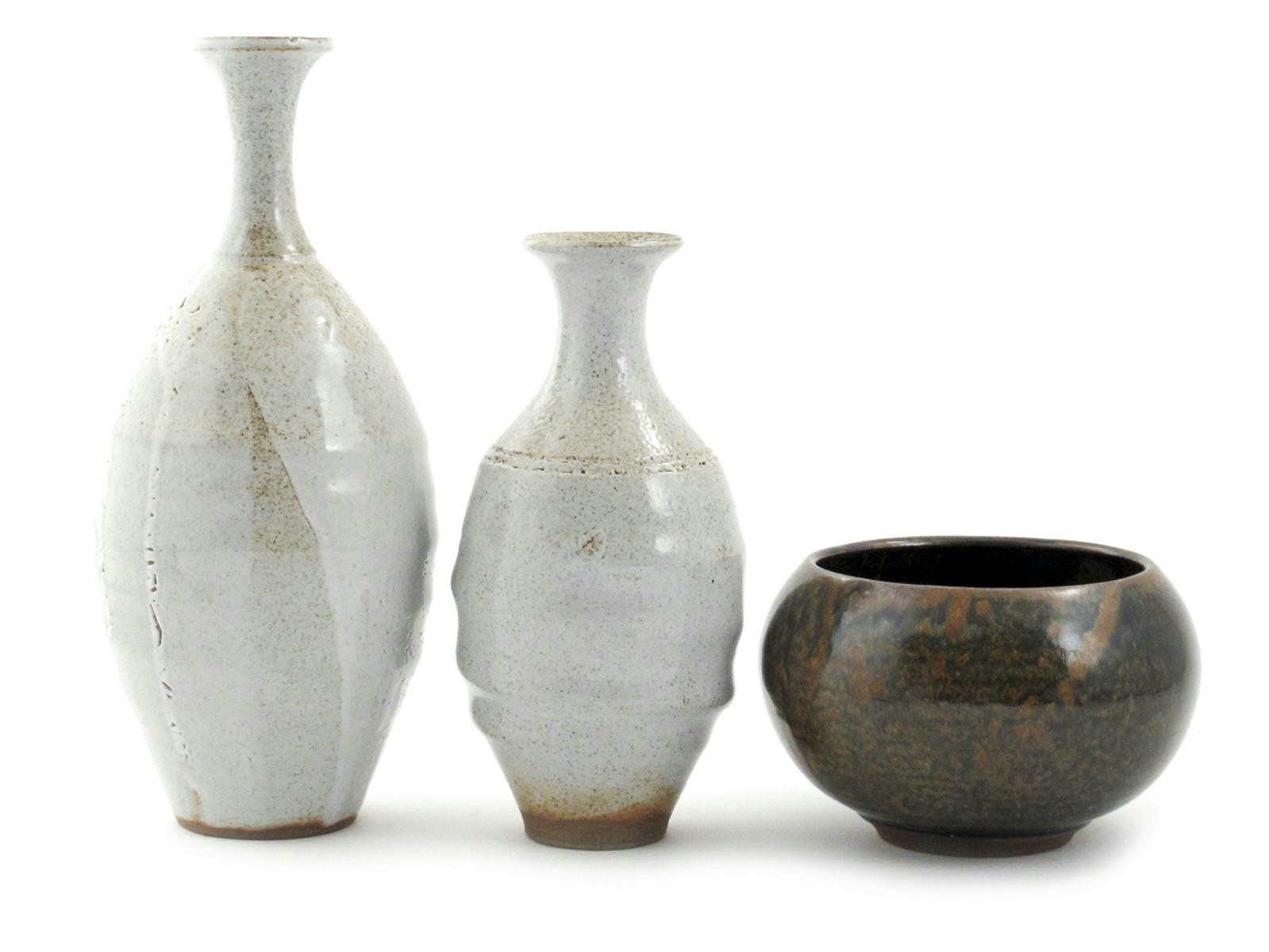 a stoneware bottle vase, covered to the foot in a textured grey glaze, another smaller, and a bowl with inverted rim, impressed seal marks, 32cm. high