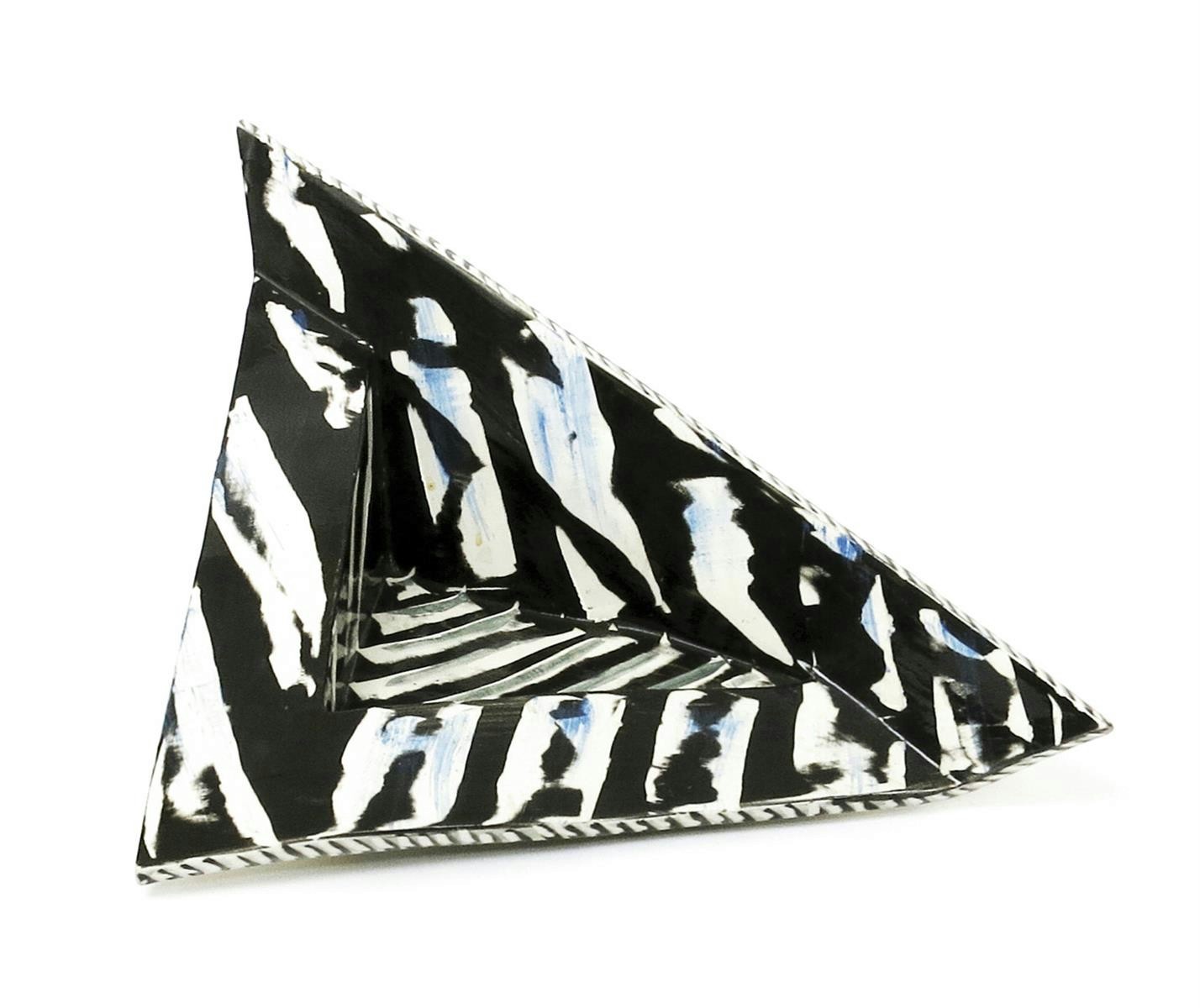 a bowl form, angled triangular form, abstractly painted in black and white highlighted in blue painted signature 36cm. wide