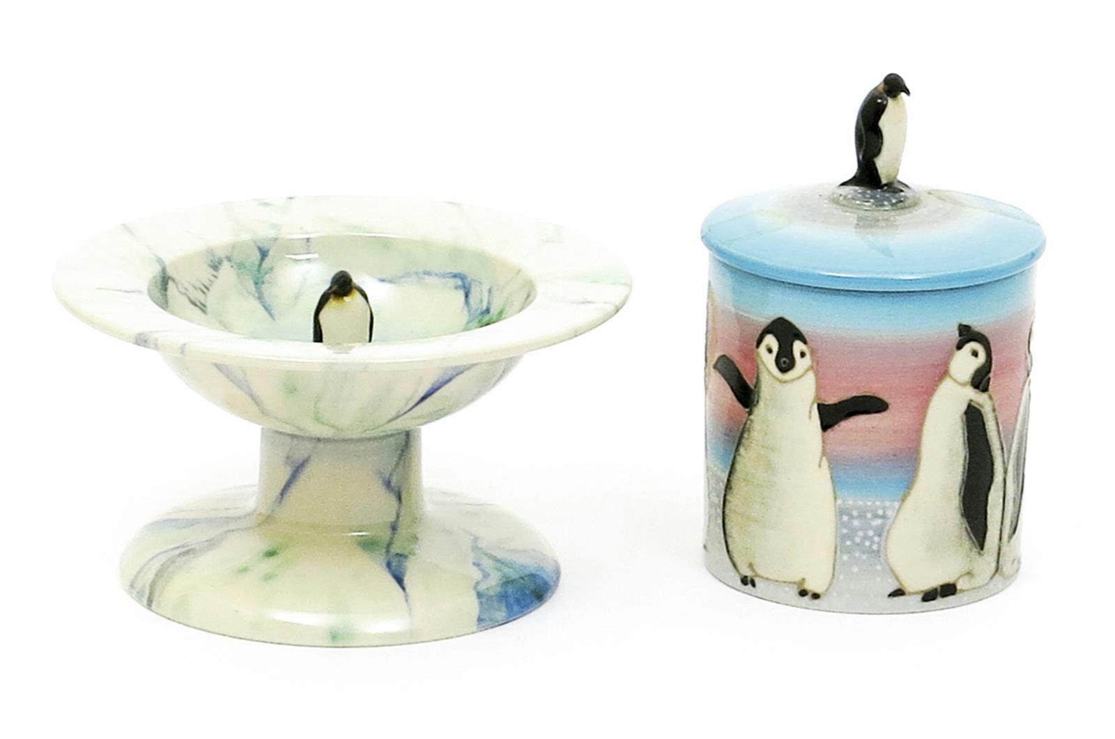 'Penguin' a Dennis Chinaworks tazza and preserve pot and cover designed by Sally Tuffin, dated 2004 and 2005 painted in colours impressed and painted marks, tazza 15cm. diam.