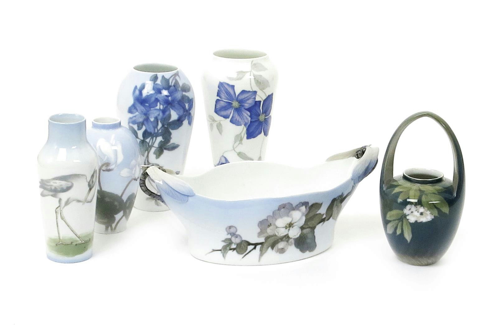 A Royal Copenhagen porcelain vase, model 323, elliptical form cast with dragonfly handles, painted with prunus blossom in colours on a pale blue ground, and a collection of eleven Royal Copenhagen, Rosenthal and other pieces impressed, printed and painted marks, damages 31cm wide