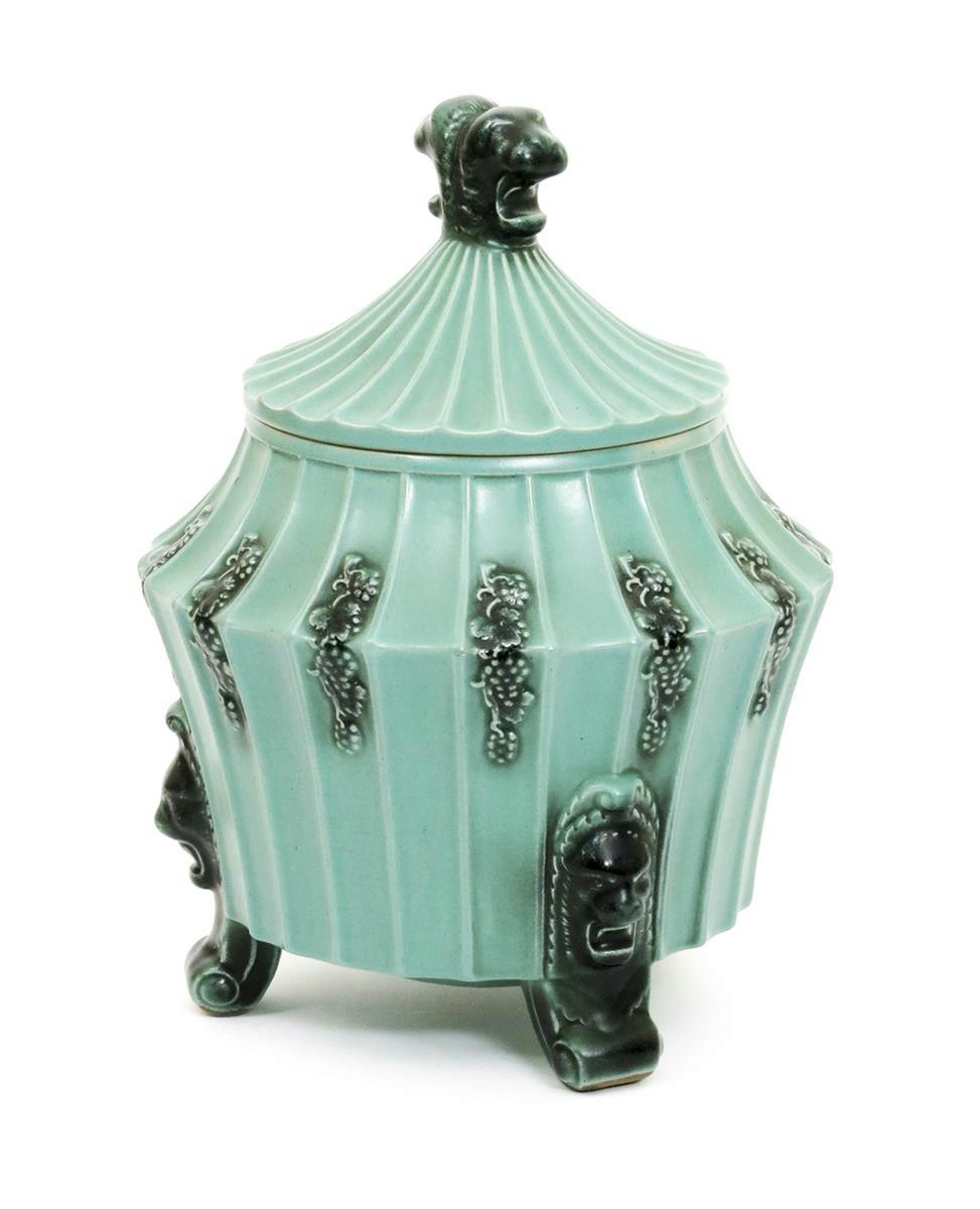 A Eckhardt & Engler Secessionist pottery tureen and cover, model no.1697, in the manner of Albin Muller, fluted form, on three scroll feet with lion mask terminals, glazed matt mint green, the fluted cover with similar mask finial stamped marks, 36cm. high