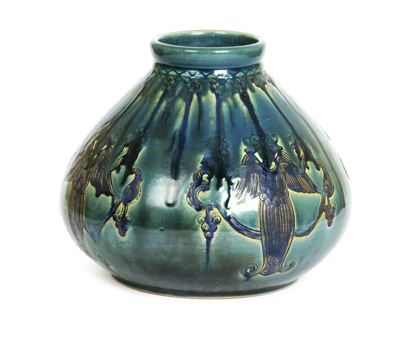 An unusual Primavera pottery vase, compressed ovoid form with collar rim, incised with a frieze of middle eastern fertility goddesses under a running blue glaze impressed mark, 25cm. high