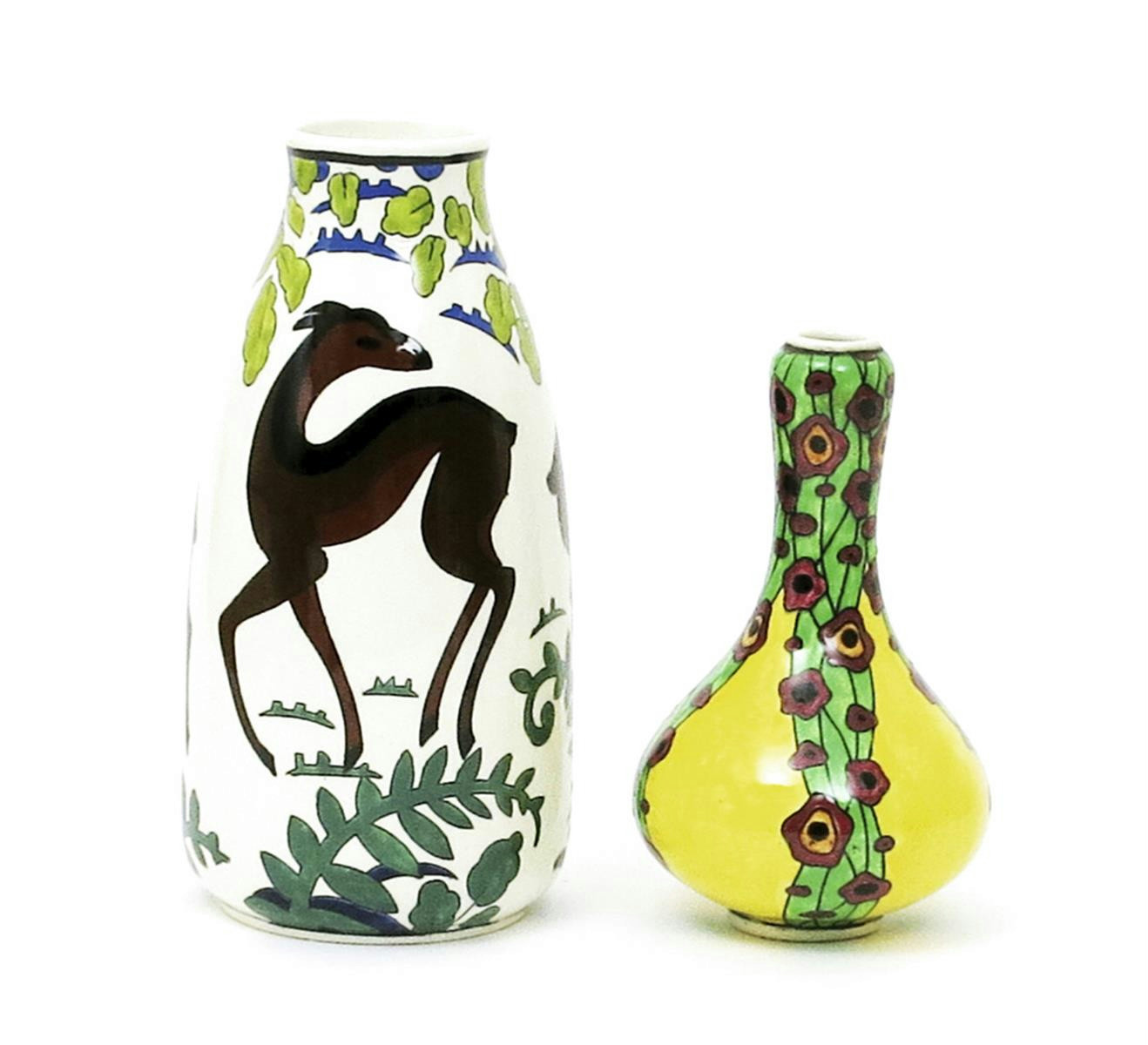 A Boch Freres Keramis vase designed by Charles Catteau, pattern D1434, shouldered form, decorated with deer in a stylised forest, in colours on a white ground, and another Boch Freres Keramis vase printed and painted marks, 29cm. high