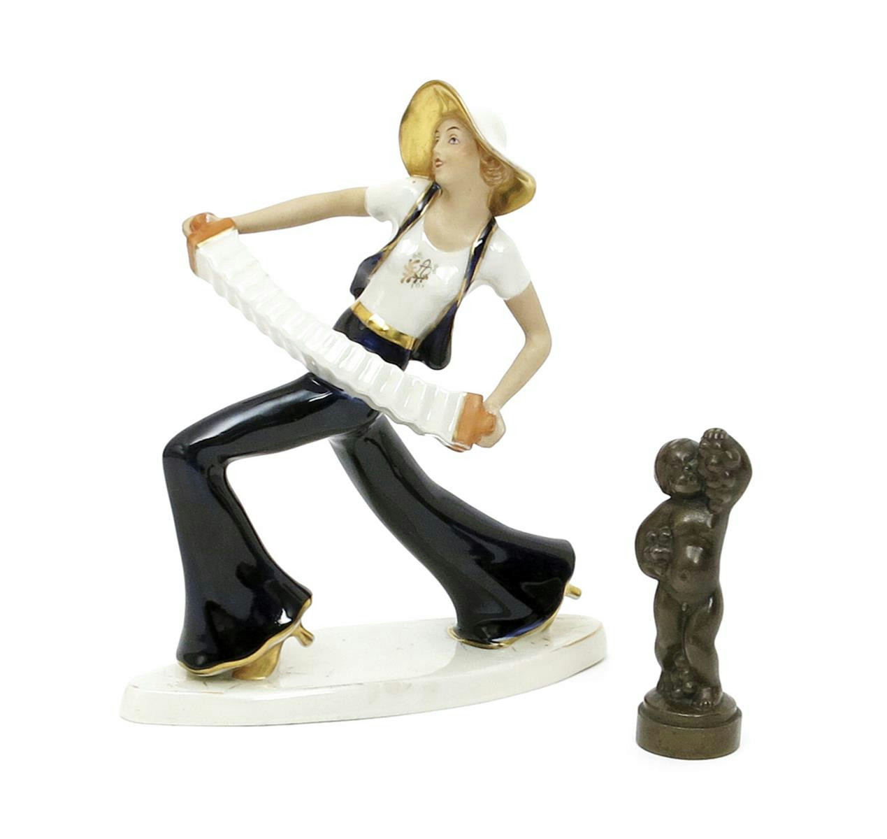 A Royal Dux Pottery figure of a woman playing the accordion, wearing broad rimmed sun hat and blue waistcoat and pantaloon suit, highlighted in gilt, a small bronze model of a child holding bunches of grapes by Sv Lindhart impressed and printed marks 25cm. high