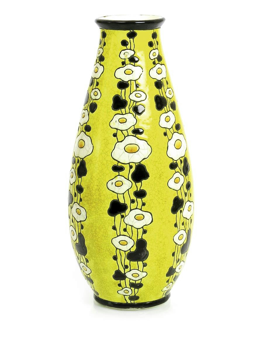 A Boch Freres Keramis vase designed by Charles Catteau, pattern D.815, enamelled with columns of stylised flowers in shades of black, white and yellow on a vivid lemon yellow ground impressed, printed and painted marks, 33cm. high