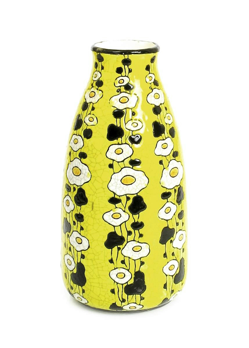 A Boch Freres Keramis vase designed by Charles Catteau, pattern D.815, painted with columns of stylised flowers in white, black and yellow on a vivid crackled lemon ground printed and painted marks, 29cm. high