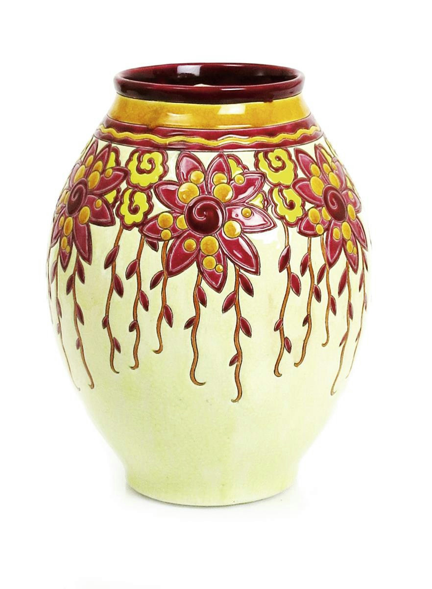 A Boch Freres Keramis vase designed by Charles Catteau, pattern 963, shape 2334, enamelled with a band of stylised flowers and foliage in pink and yellow on a crackled off white ground impressed and printed marks, 32cm. high