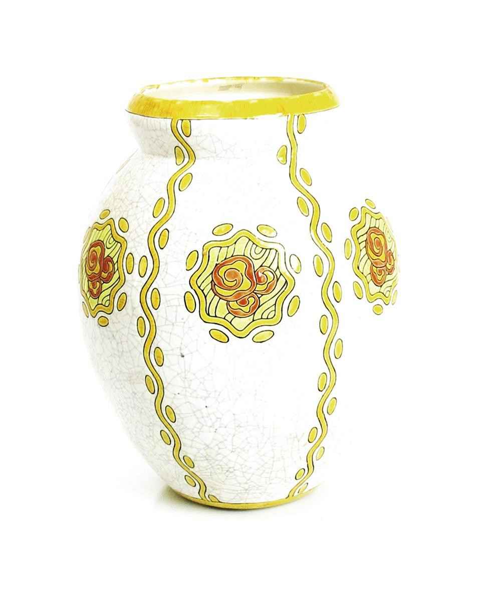 A Boch Freres Keramis vase designed by Charles Catteau, pattern D.750, painted with stylised flowerheads in shades of yellow and orange on a crackled white ground impressed and printed marks, facsimile signature 35cm. high