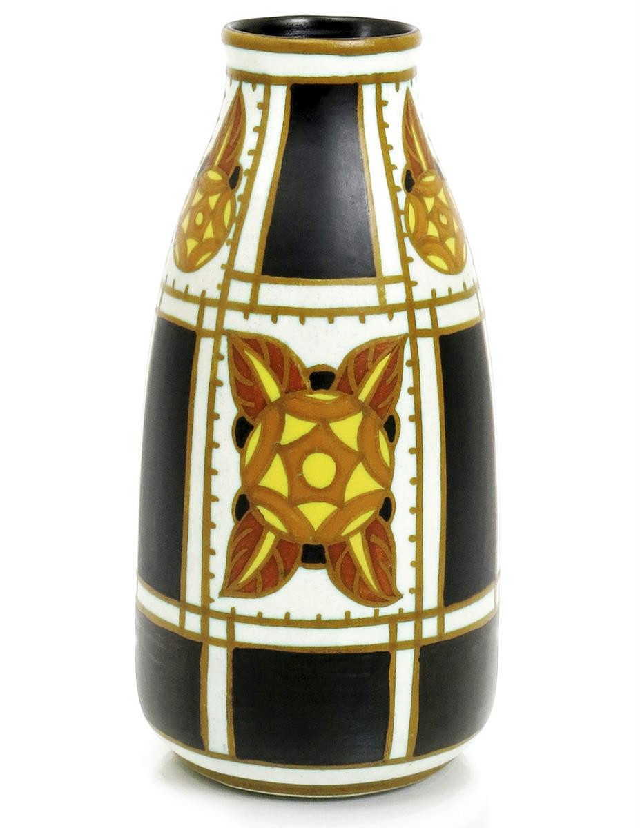 A Boch Freres Keramis vase designed by Charles Catteau, pattern D.1111, shape 896, painted with panels of stylised flowerheads and foliage in orange and yellow on a black and white trellis ground printed mark, facsimile signature 29cm. high