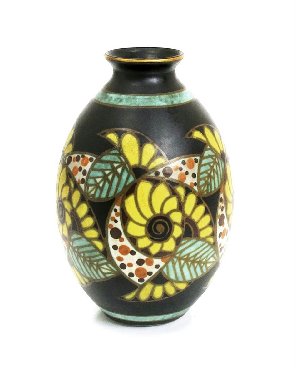 A Boch Freres Keramis vase designed by Charles Catteau, pattern D.1084, painted with scrolling flowers and foliage in colours on a matt brown ground printed and painted marks, 31cm. high
