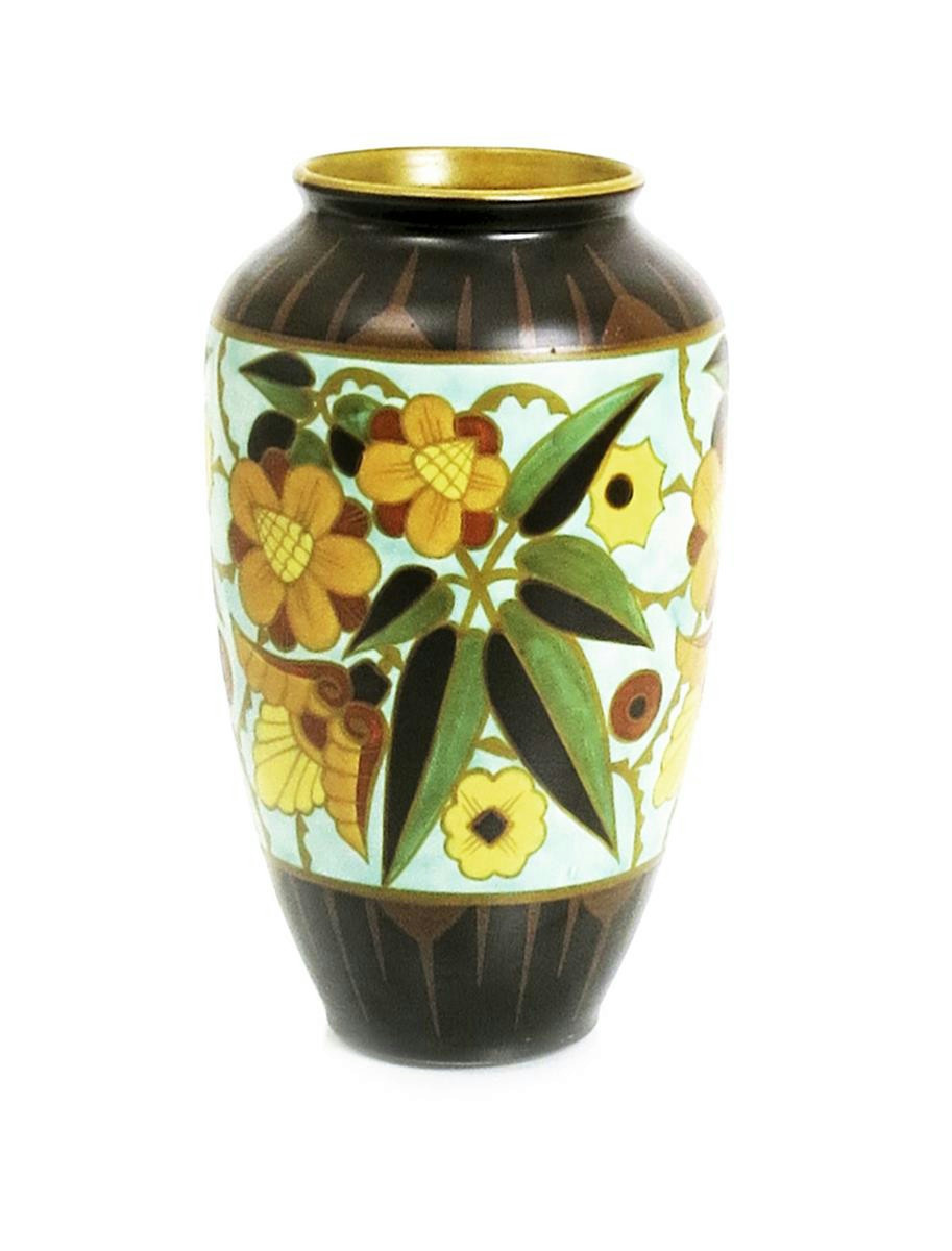 A Boch Freres Keramis vase designed by Charles Catteau, pattern D.1847, shape no.914, painted with stylised flowers and foliage in colours on a matt brown ground printed and painted marks, 34cm. high
