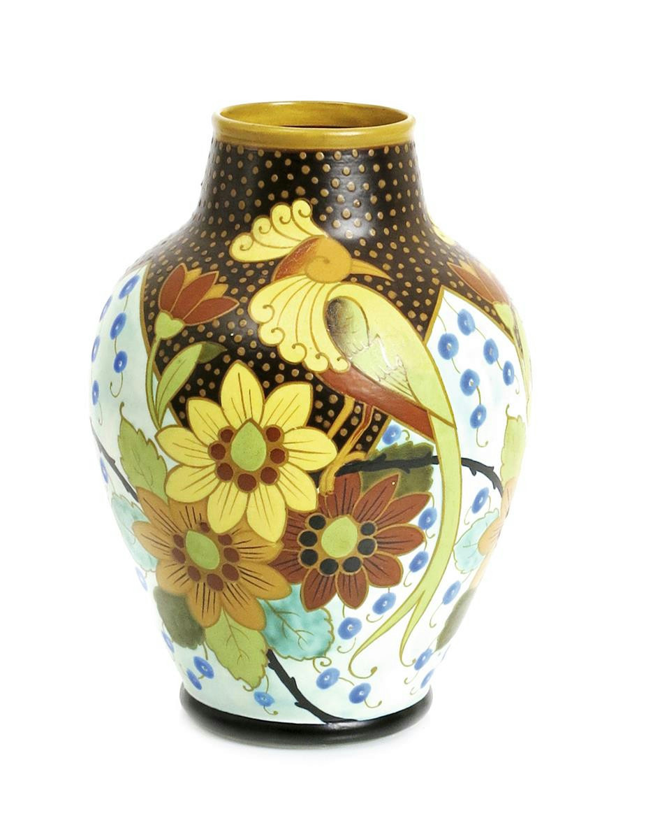 A Boch Freres Keramis vase designed by Charles Catteau, pattern D.1849, shape 909, painted with exotic birds amongst stylised flowers and foliage, printed and painted marks, 30cm. high