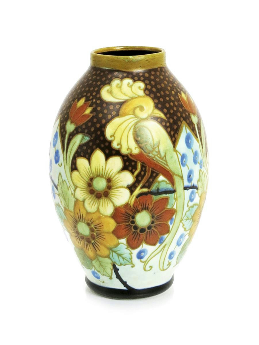 A Boch Freres Keramis vase designed by Charles Catteau, pattern D1849, painted with flowers and foliage on a brown ground printed and painted marks, 27cm. high