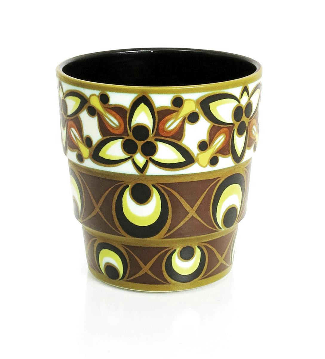 A Boch Freres Keramis vase designed by Charles Catteau, pattern D.1739, shape 1190, stepped, cylindrical form, painted with bands of stylised flowers and geometric designs in colours printed and painted marks, 18cm. high