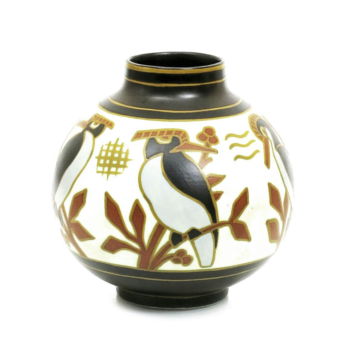 A Boch Freres Keramis vase designed by Charles Catteau, pattern D.1348, painted with birds perched on a stylised foliate bough, in colours on a cream ground printed and painted marks, facsimile signature 24cm. high