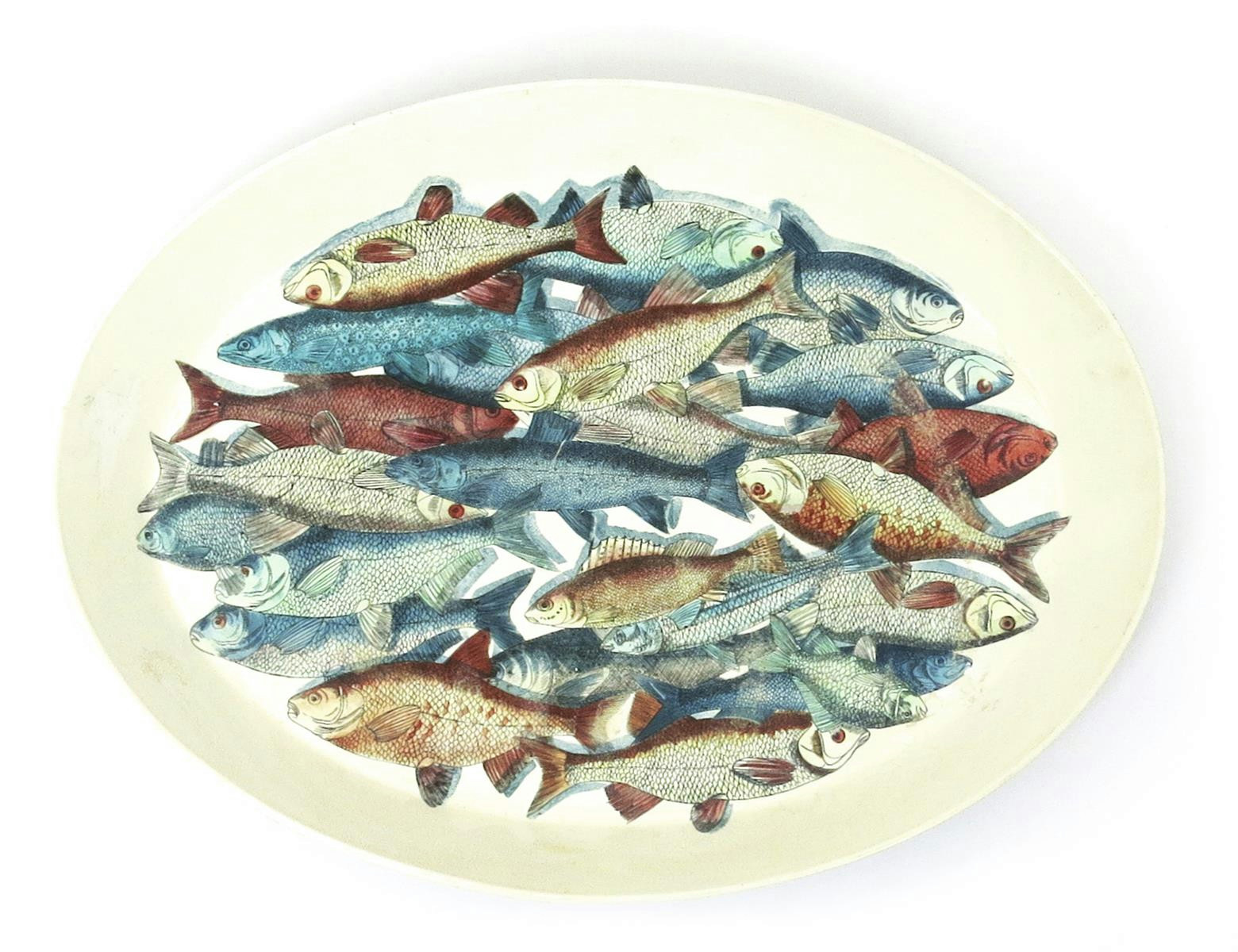A Fornasetti enamelled tin tray designed by Piero Fornasetti, elliptical form, enamelled with a shoal of fish in colours retail label to reverse 46cm. wide