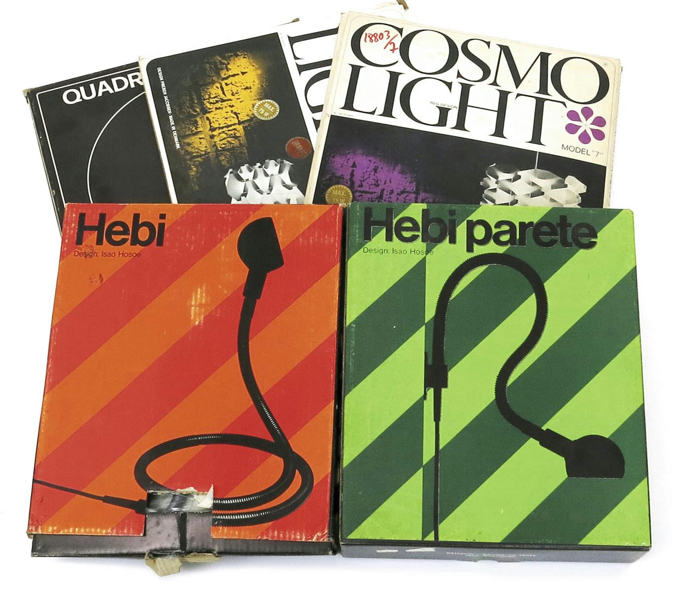 Two Hebi Parete Isao Hosoe lights, in original packaging, three Cosmo Light shades designed by Preben Jacobsen, in original packaging, an enamelled metal hanging light and three metal trays
