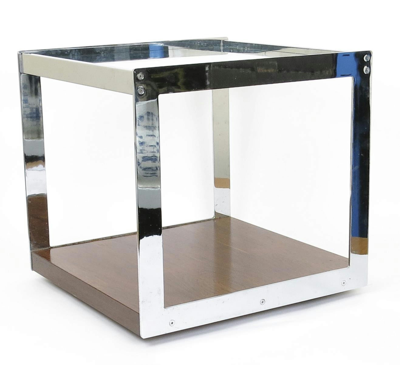 A Merrow Associates chrome and glass occasional table, square section with rosewood veneer shelf, on castors, 53 x 55cm.