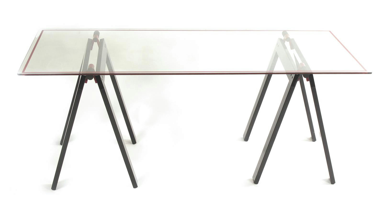 A Zanotta Gaetano desk designed by Gae Aulenti, tempered glass on removable Aluminium base with rubber grip rests, 180 x 80cm.