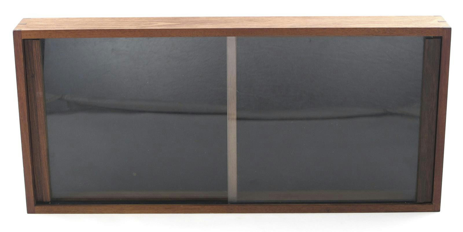 A Swann teak wall mounted display cabinet, rectangular, with glazed sliding doors, applied label and Design Centre label 78.5cm. wide