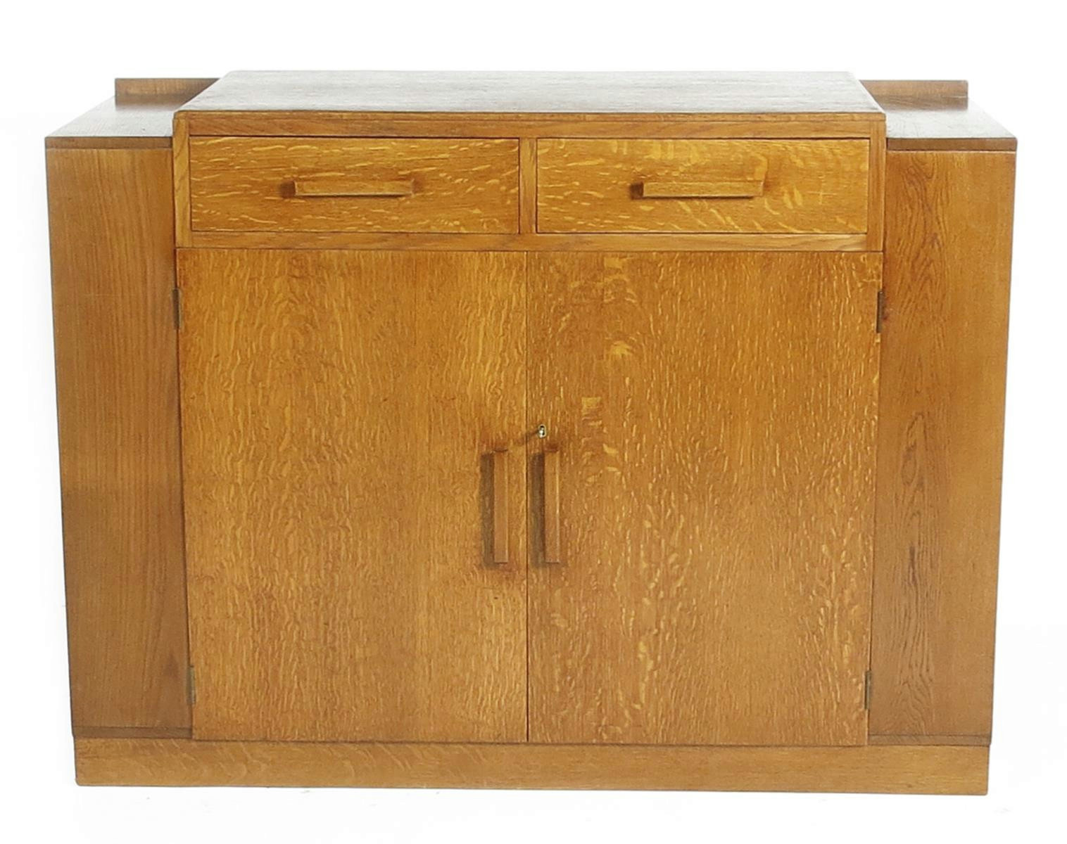 A Heal's oak sideboard with bookcase ends, with wooden bar handles, one drawer fitted applied ivorine button to drawer 87cm. high, 121cm wide, 48cm deep