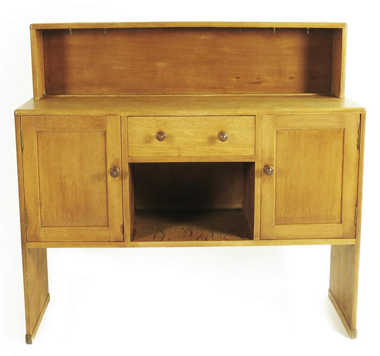 A Heal's weathered oak sideboard, central drawer with flanking cupboards, below mantle with metal cup hooks, inset ivorine label 129cm. wide, 122cm. high
