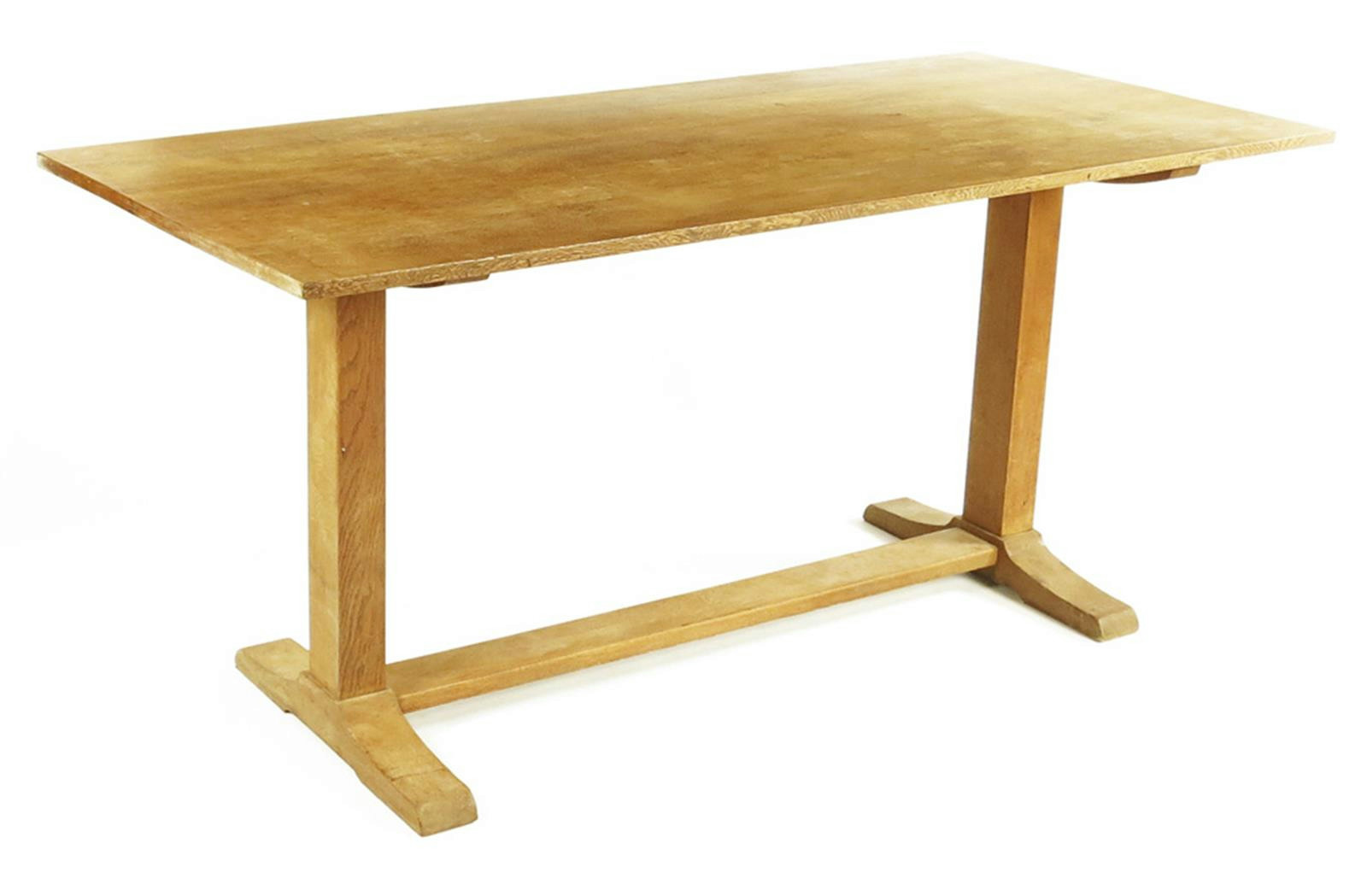 A Heal's oak dining table, on simple square legs and H stretcher, applied ivorine label, 168 x 76cm.