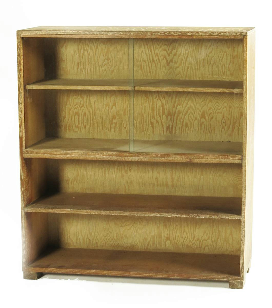 A weathered oak bookcase, possibly Bowman Brothers, with glazed sliding doors, 103cm. wide, 92cm. high