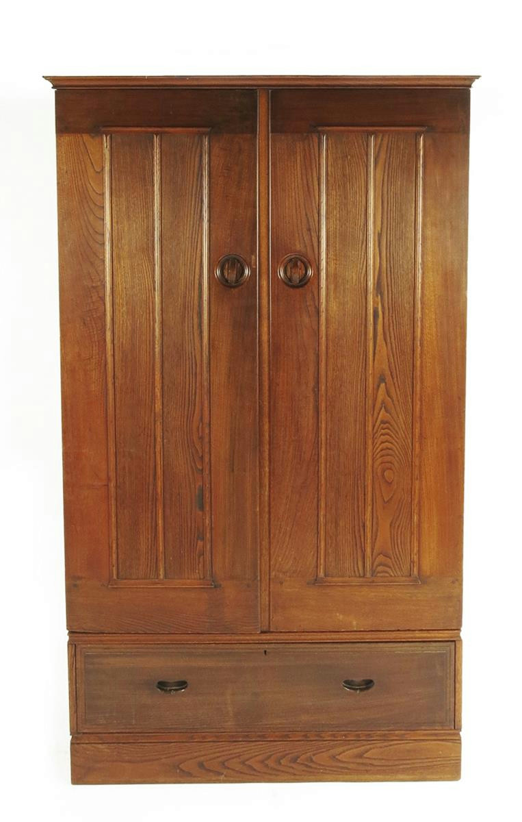 A Heal's Simple Bedroom Furniture chestnut fitted wardrobe on stand designed by Ambrose Heal, the drawer with carved heart-shaped pulls, the cupboard with carved, locking handles, applied label 191cm high, 113cm wide