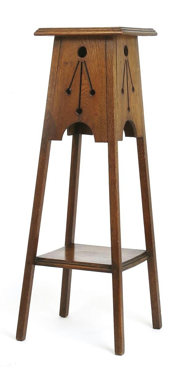 An Arts and Crafts oak jardiniere stand, square top with flaring legs, with pierced decoration to substructure, 91cm high, top 25cm square