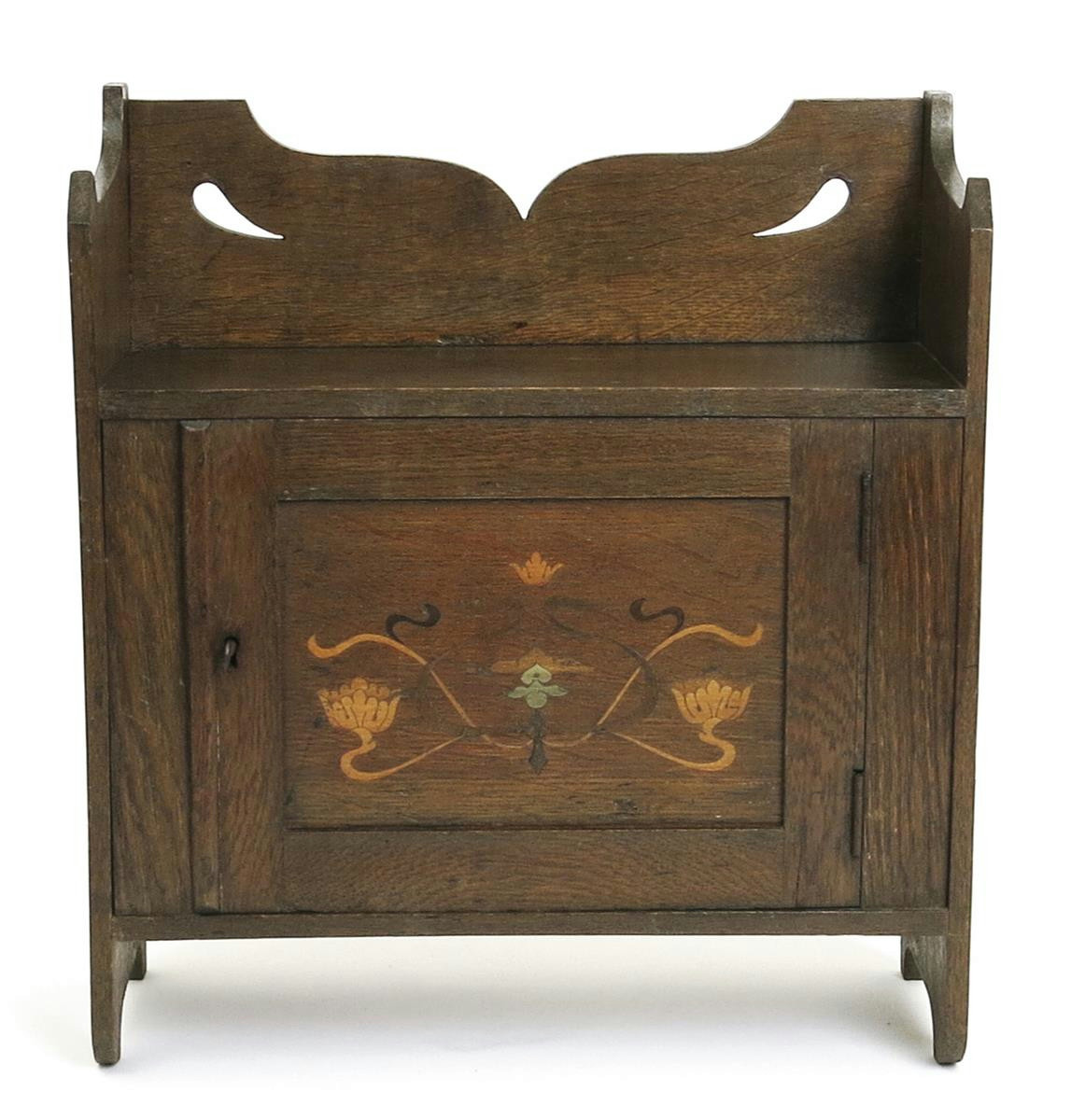 An Arts and Crafts oak wall cabinet, possibly Shapland & Petter, the hinged door with pewter and marquetry floral inlay painted 236 to reverse 39cm. wide