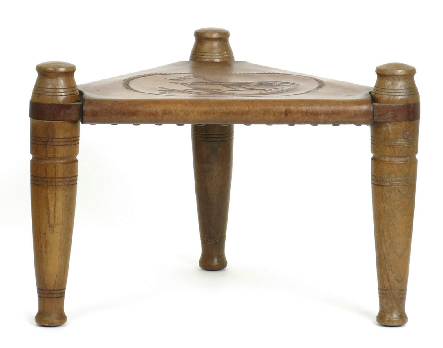A leather strung oak and mahogany stool, triangular section on three turned wood legs, the seat with tooled Celtic knot motif faded paper label to underside 44cm. diam.