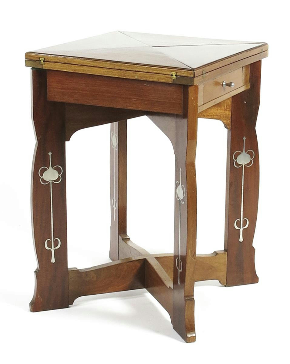 A P.E. Gane inlaid mahogany card table, square top with hinged flaps containing counter dishes, inlaid with pewter Art Nouveau flower stems 79cm. high, 53.5cm square top