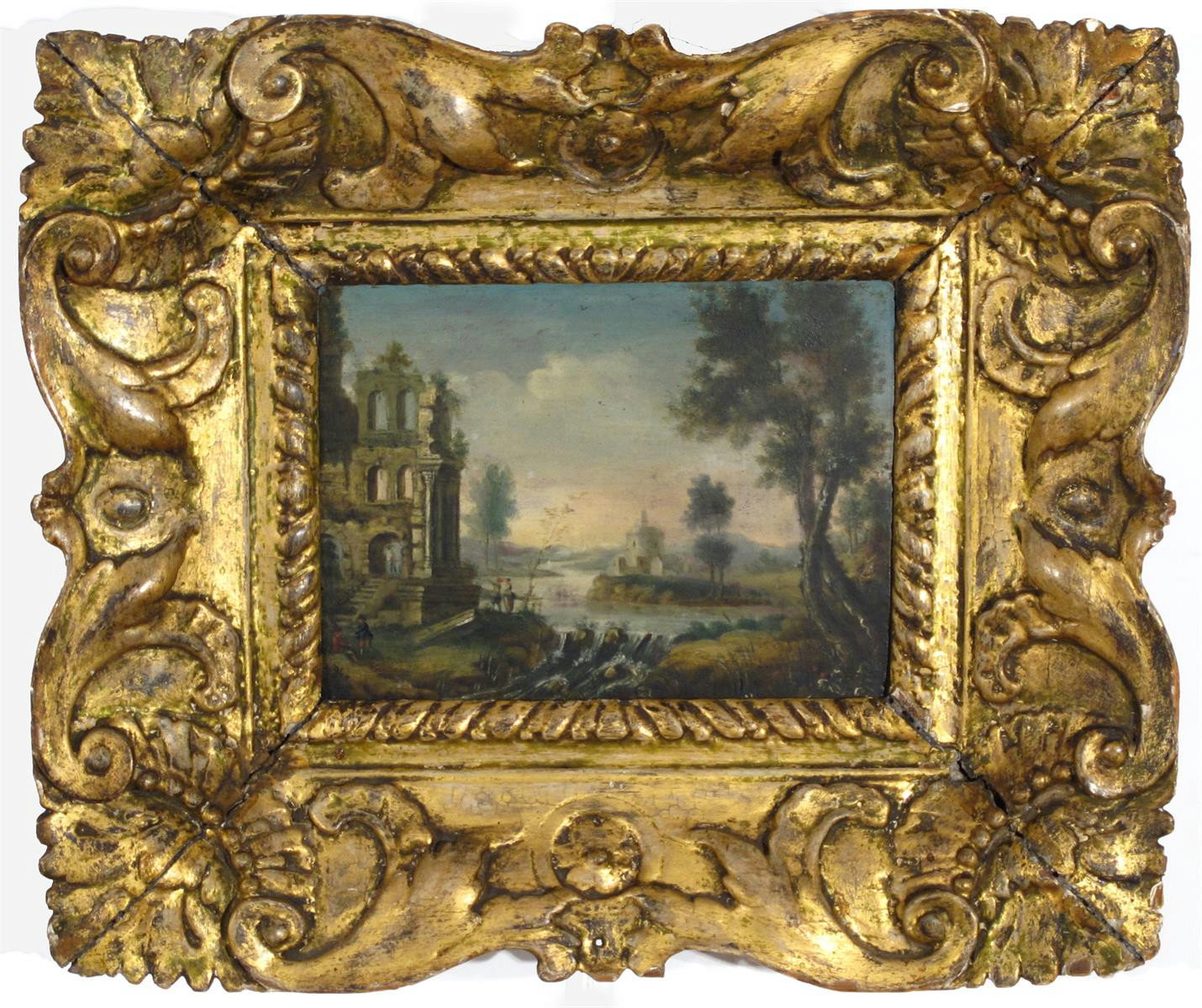 Flemish School Early 19th Century Figures by a ruined castle and rapids Oil on panel 13 x 17cm; 5...