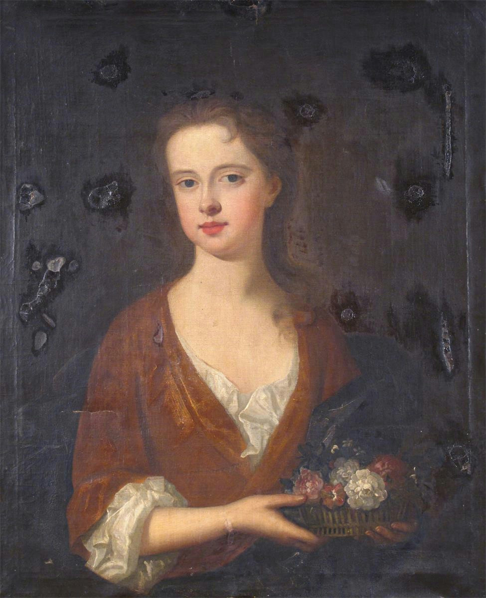 Follower of Godfrey Kneller Portrait of a lady holding a basket of flowers Oil on canvas