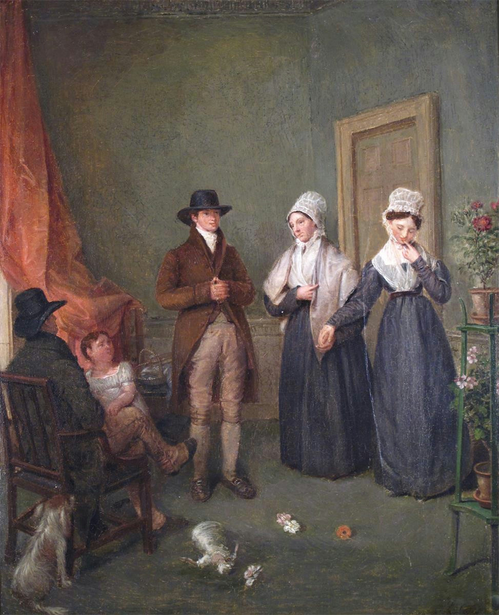 English School early 19th Century Interior scene with a young couple meeting Signed indistinctly...