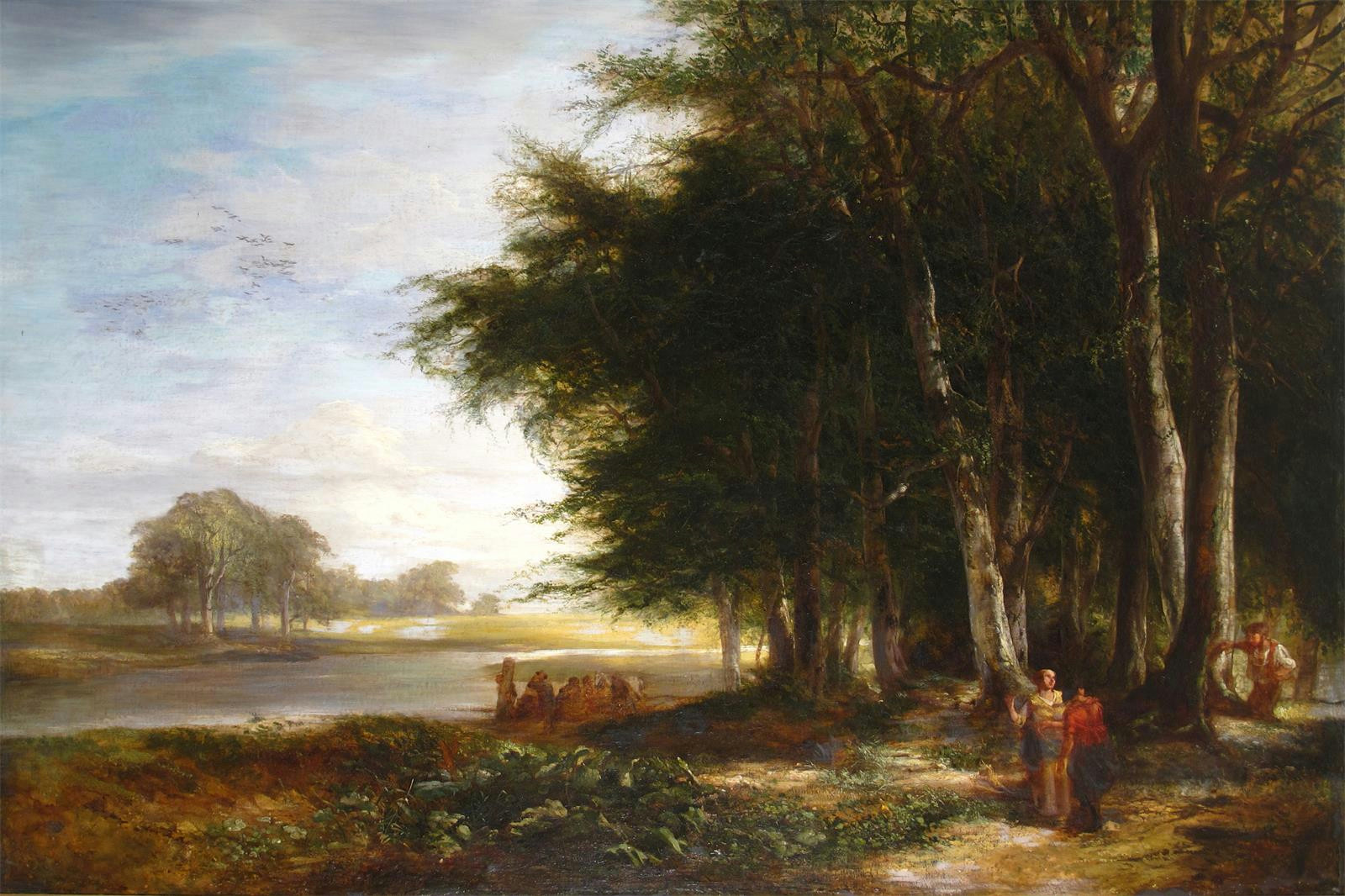 Continental School 19th Century Poachers by a river in a wooded landscape Oil on canvas 104 x...