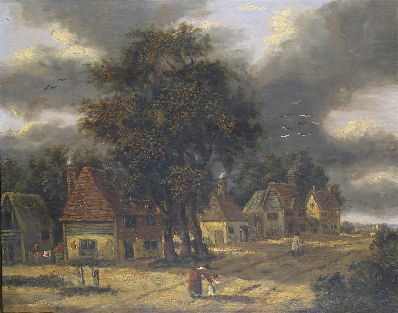 George Vincent (1796-c.1831) Figures in a rural hamlet Oil on panel 30.5 x 30.5cm; 8 x 12in...
