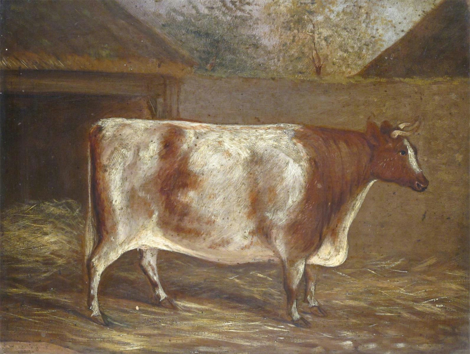 Signed and dated 1889 and inscribed This is a prize cow belonging to Capt. Horsell of Marsh Cottage - Won a silver cup at Divizes against the County of Wilts in 1839 - likeness taken by Mr. R Woodroff from London