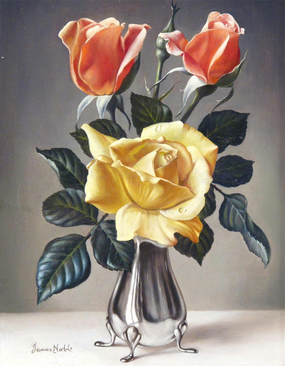 ‡James Noble (1919-1989) Yellow and flame roses Signed Oil on canvas 25 x 20cm; 10 x 8in...